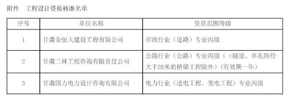 按照《行政許可法》、《建設(shè)工程勘察設(shè)計(jì)資質(zhì)管理規(guī)定》(建設(shè)部令第160號(hào))、《《工程設(shè)計(jì)資質(zhì)標(biāo)準(zhǔn)》(建市[2007]86號(hào))的規(guī)定,經(jīng)我廳審核,并于2016年9月27日至2016年10月14日在甘肅省住房和城鄉(xiāng)建設(shè)廳網(wǎng)站公示無(wú)疑義,同意核準(zhǔn)甘肅金恒大建設(shè)工程有限公司等3家單位的工程設(shè)計(jì)資質(zhì),F(xiàn)將資質(zhì)核準(zhǔn)結(jié)果予以公布。